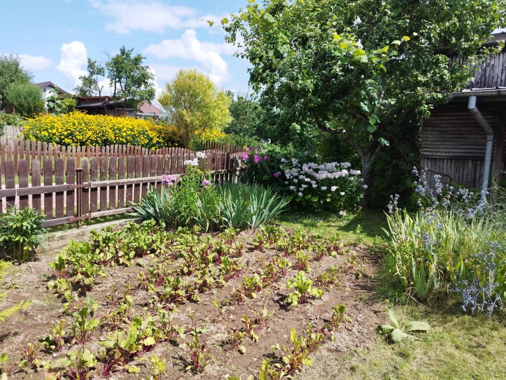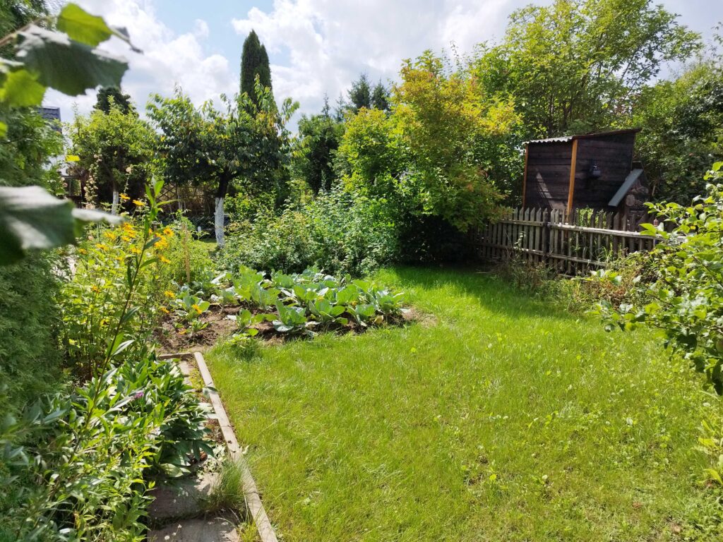 Zasadzone drzewa owocowe; 2 jabłonie (antonówka – owocują naprzemiennie), malinówka 1, 2 czereśnie obficie owocujące (wczesne), agrest, czarna porzeczka, winogrona, pigwa.