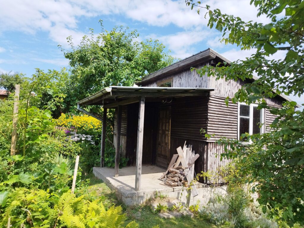 Działka ogrodzona, drewniany domek z podpiwniczeniem (niewykończony), doprowadzony prąd, woda, 2 kompostowniki.